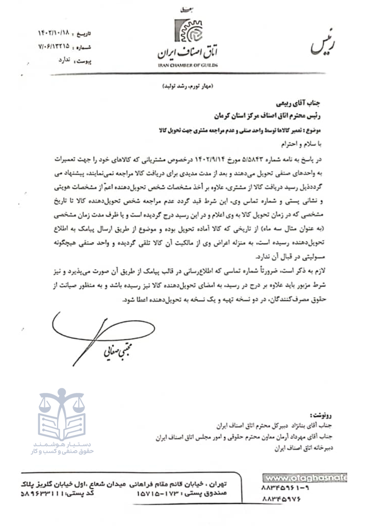 در پاسخ به نامه شماره ۵٫۵۸۴۳ مورخ ۱۲۰۲٫۹٫۱۴ در خصوص مشتریانی که کالاهای خود را جهت تعمیرات به واحدهای صنفی تحویل میدهند و بعد از مدت مدیدی برای دریافت کالا مراجعه نمی نمایند. پیشنهاد می گردد ذیل رسید دریافت کالا از مشتری علاوه بر آخذ مشخصات شخص تحویل دهنده اعم از مشخصات هویتی و نشانی پستی و شماره تماس وی این شرط قید گردد عدم مراجعه شخص تحویل دهنده کالا تا تاریخ مشخصی که در زمان تحویل کالا به وی اعلام و در این رسید درج گردیده است و با ظرف مدت زمان مشخصی به عنوان مثال سه ماه از تاریخی که کالا آماده تحویل بوده و موضوع از طریق ارسال پیامک به اطلاع تحویل دهنده رسیده است به منزله اعراض وی از مالکیت آن کالا تلقی گردیده و واحد صنفی هیچگونه مولیتی در قبال آن ندارد.
